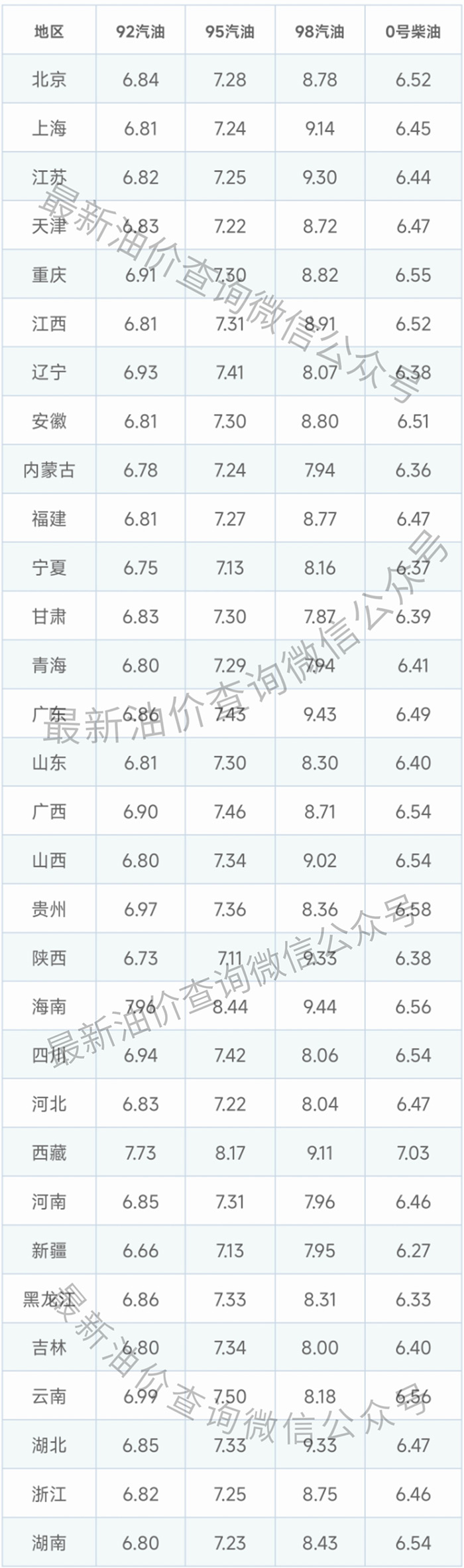 备注:云南、陕西、四川、辽宁、新疆、青海、西藏,贵州、内蒙古、黑龙江油价没有实现统一价格,